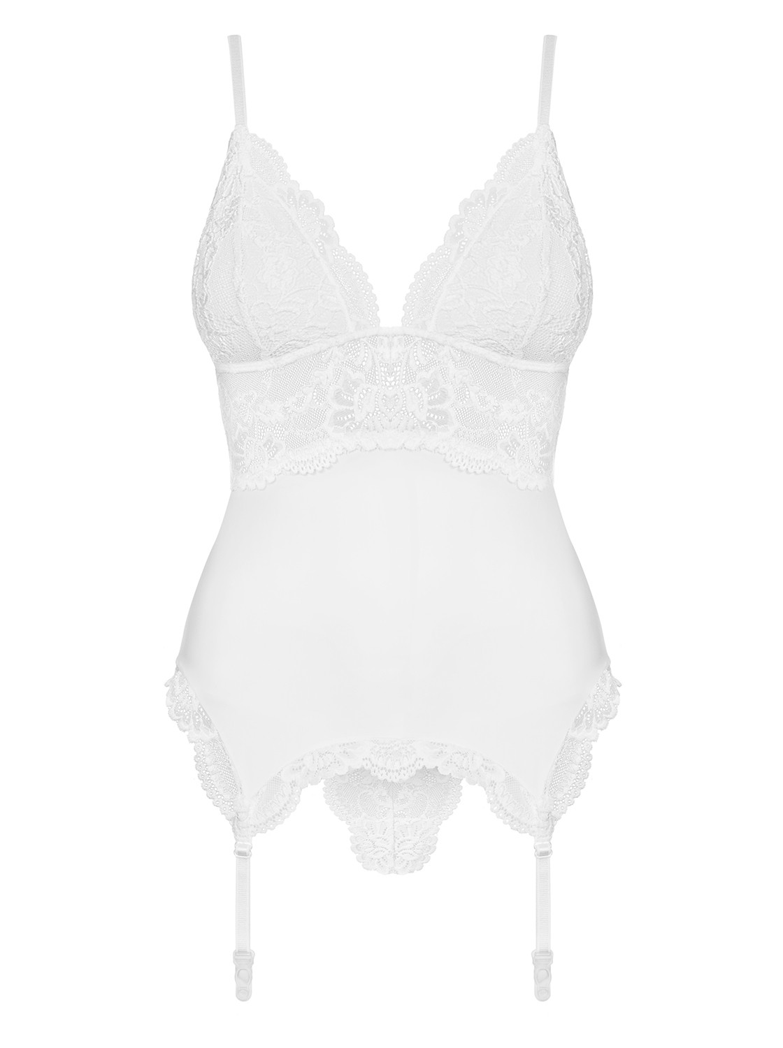 Vous allez devenir une bombe, oui c’est le mot, avec cette superbe guêpière blanche d’un tissu extensible et moulant. Les bonnets sont avec un rembourrage pour le confort et la beauté des seins et bretelles réglables. Une jolie bande de dentelle blanche transparente se trouve sous la poitrine et sublime le dos.De très belle finition pour cette guêpière à laquelle vous pouvez y ajouter des bas (non inclus) grâce aux jarretelles réglables. Le string blanc avec de la dentelle est compris.Composition : 85% Polyamide, 15% Elasthanne