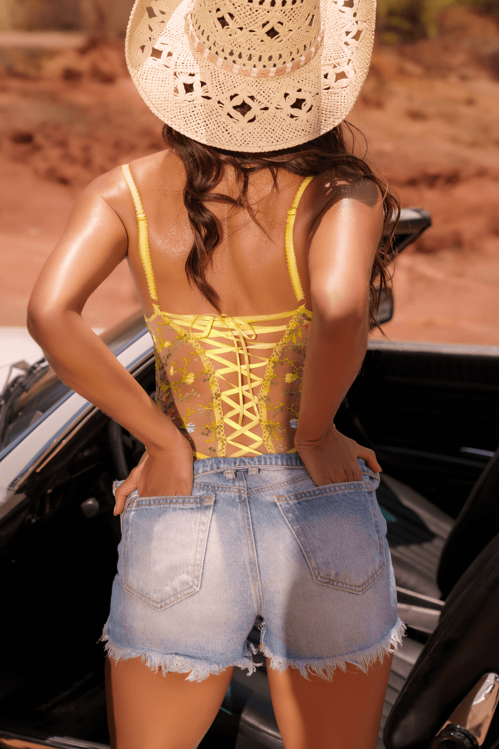 Succombez au charme de ce body jaune éclatant signé Mapalé, confectionné en tulle transparent brodé de fleurs colorées. Chaque détail est pensé pour magnifier la silhouette :???? Armatures de maintien,???? Bretelles réglables,???? Fermeture pression à l?entrejambe pour le confort,???? Et surtout un dos nu sublimé par un laçage croisé ultra sensuel.Son design floral illumine la peau, tandis que sa coupe audacieuse laisse juste ce qu?il faut de mystère. Parfait pour les beaux jours ou une surprise sexy pleine de fraîcheur.Composition : 100% polyester. Lavage à la main uniquement.