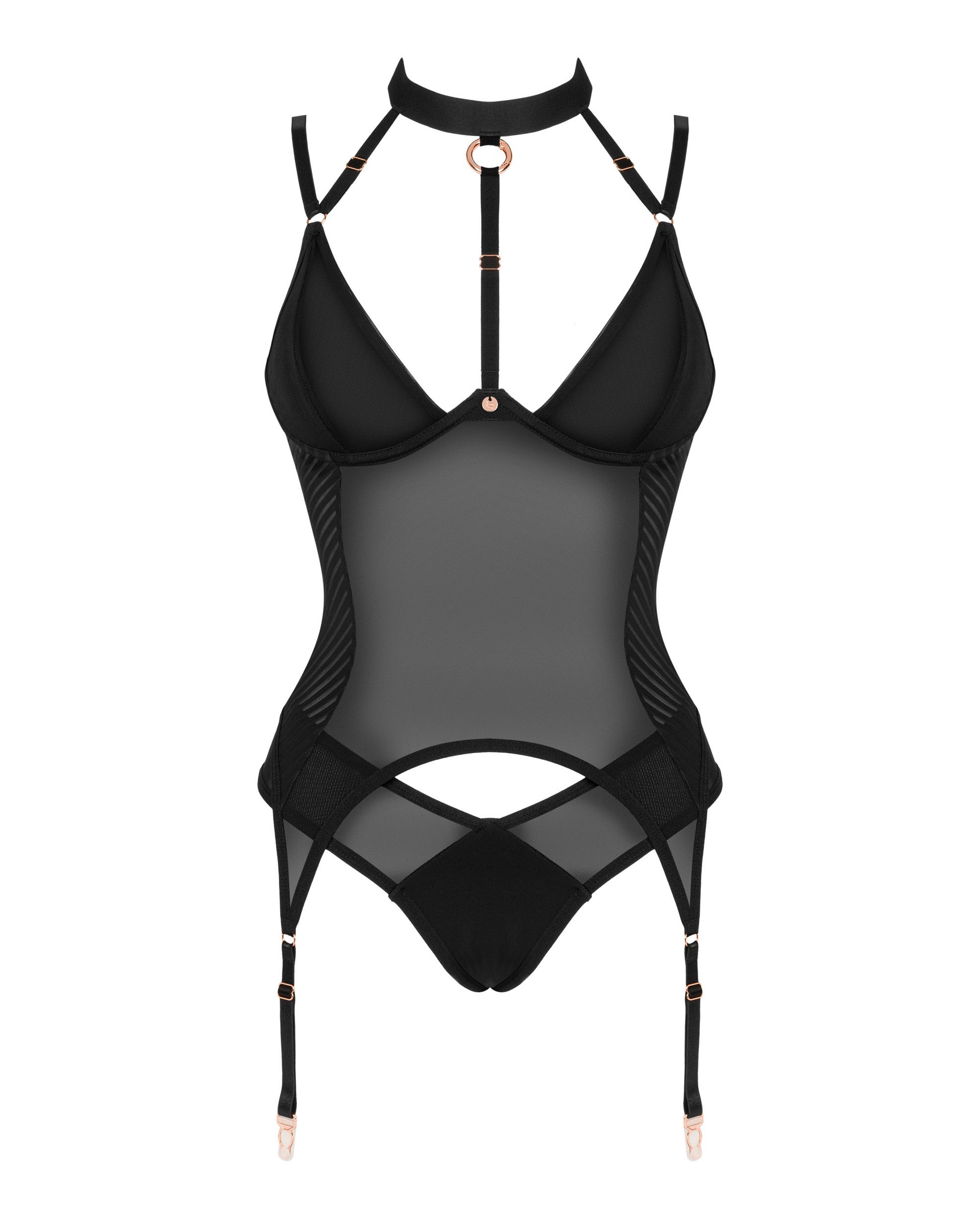 Ce corset miraculeux volera (pas seulement) votre c?ur !Buste parfaitement mis en valeur, belle coupe, culotte assortie. Détails en or rose, fermoir bijou dans la nuque et bretelle amovible à l’entre-seins, tous ces éléments réunis en un accessoire de séduction irréprochable, comme on l’aime?Découvrez plus de détails :- l’ensemble comprend un corset et une culotte- bonnets à armatures- bretelles et porte-jarretelles réglables – agréable à porter- tour de cou fermé au dos par une chaîne bijou- le tour de cou entre les seins et l’anneau métallique sont amovibles – vous décidez comment le porter- tissu doux au toucher – agréable à porter (90% polyamide, 10% élasthanne)