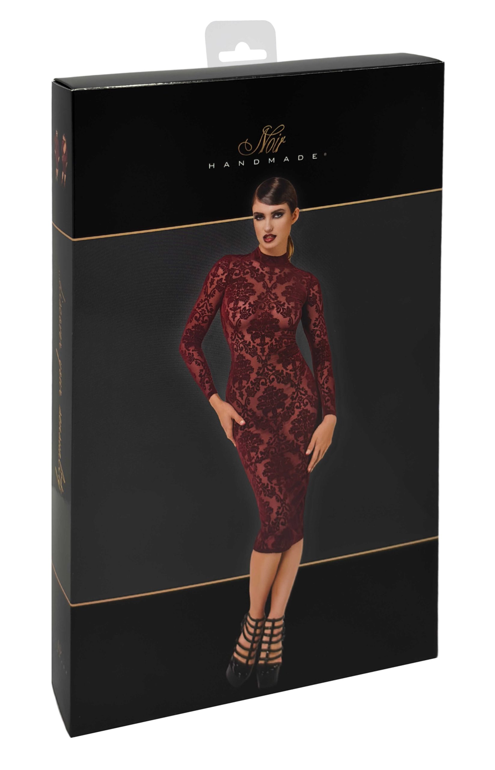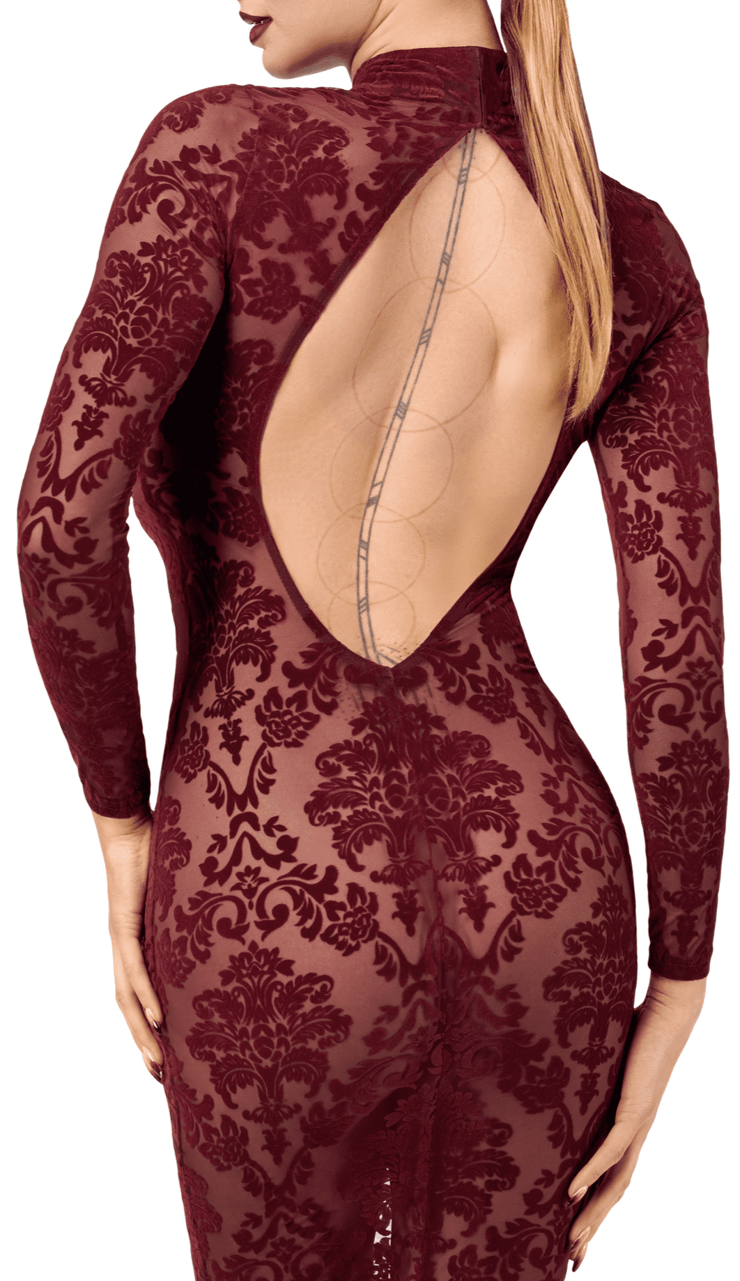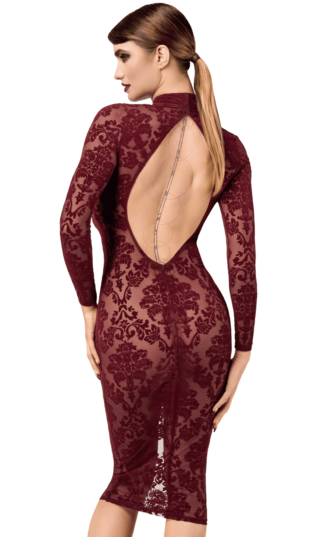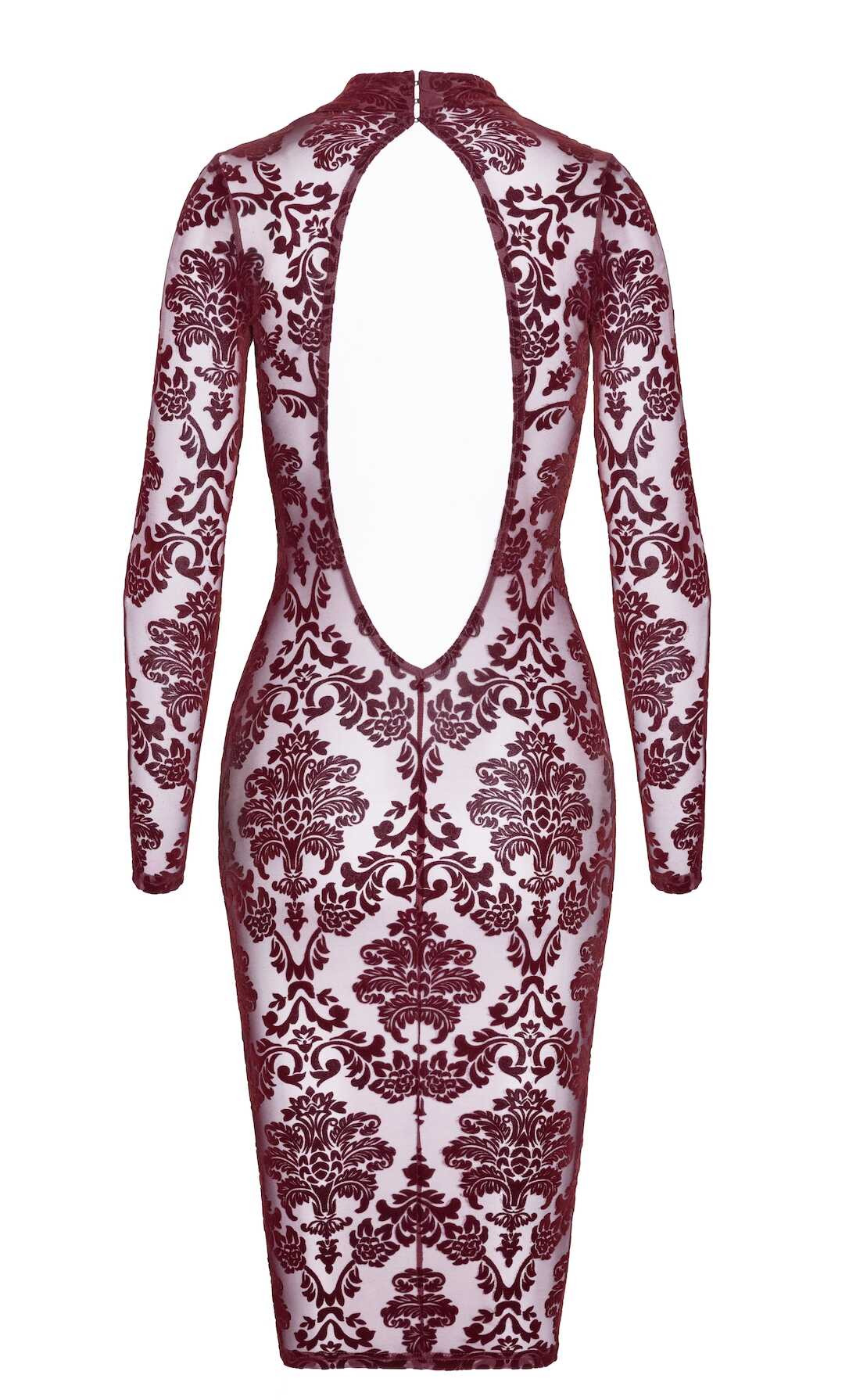 Robe midi ajustée en tulle floquée bordeaux. Dotée de manches longues, d?un dos ouvert et d?un col montant fermé par des fermetures à crochets.Matière : 86% polyester, 14% elasthan