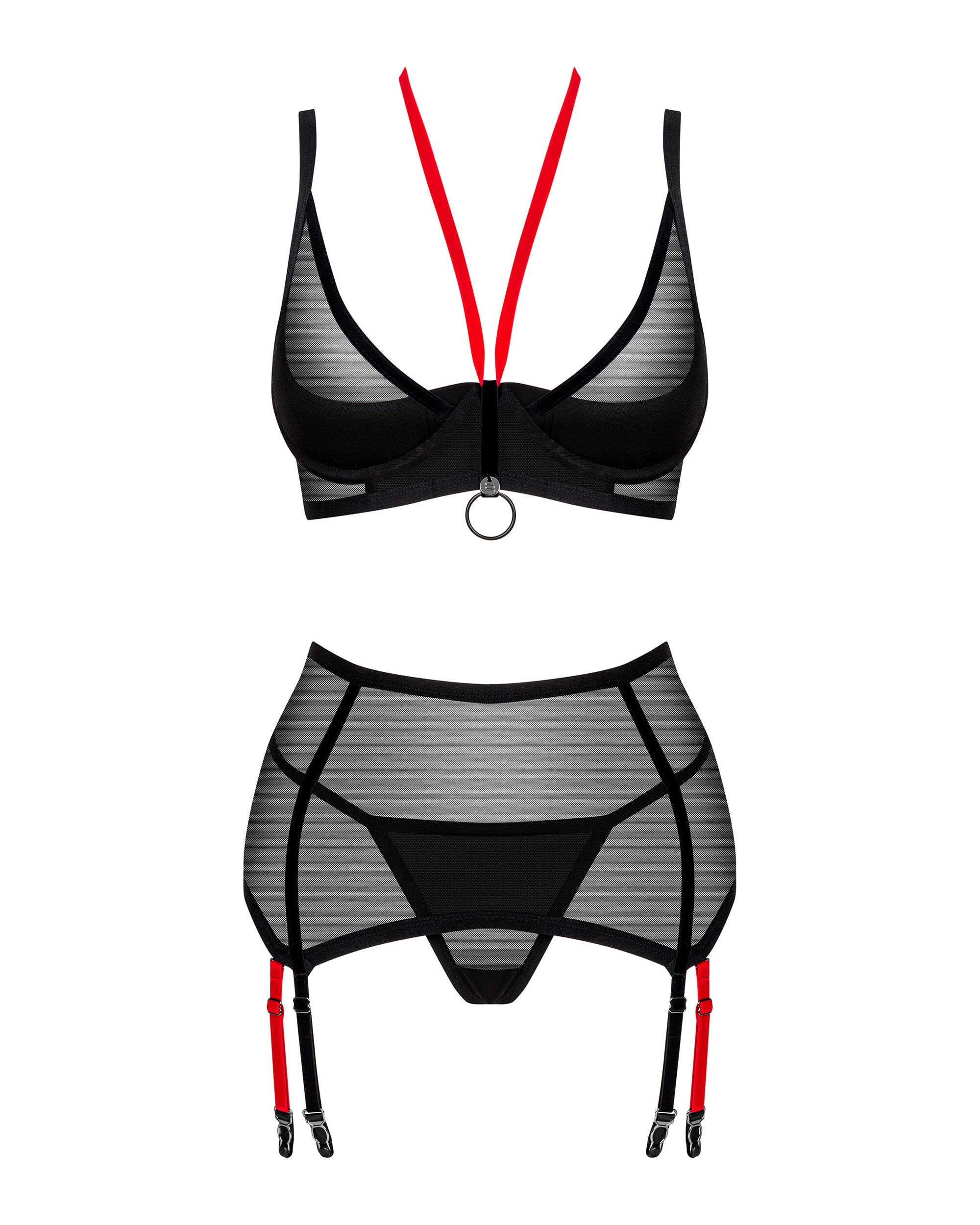 Imaginez la lumière des bougies, des regards profonds, des gestes tendres – une soirée parfaite ! La cerise sur le gâteau, c’est vous, vêtue d’une lingerie éblouissante et sexy. Il suffit de regarder ces éléments rouges qui attirent l’attention et qui créent une combinaison unique avec le tissu doux et transparent. Sentez-vous spéciale !Plus de détails :- ensemble de lingerie noire, comprenant un porte-jarretelles, un soutien-gorge et un string- ajustement parfait grâce aux bretelles réglables, à la fermeture en plusieurs étapes et au porte-jarretelles à laçage pratique- bretelles autour du cou et bonnets légèrement rembourrés avec armatures – ils mettent la poitrine en valeur de manière séduisante- des jarretelles que vous pouvez détacher quand vous le souhaitez- pendentif brillant – attire l’attention- tissu élastique, éléments en velours – confort garantiComposition : 94 % polyamide, 6 % élasthanne