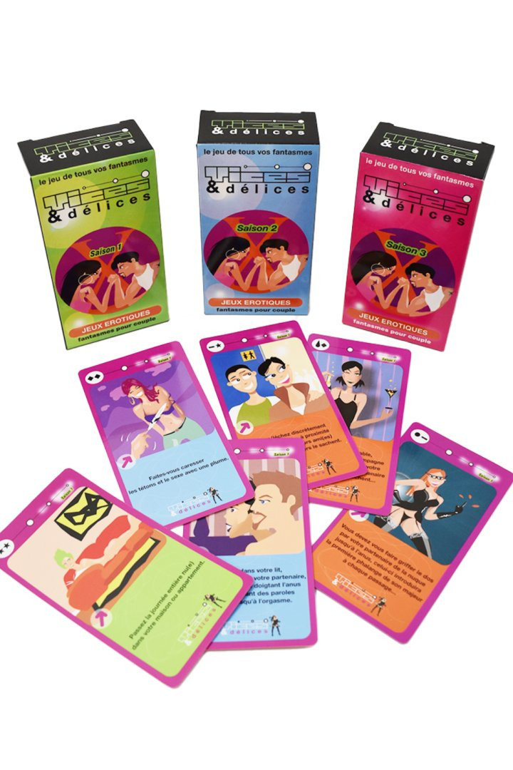 Jeu de cartes Vices et Délices Saison 2 – Jeu coquin alliant désir et fantasme. Jeu de cartes Vices et Délices Saison 2 – Jeu coquin alliant désir et fantasme. Pimentez votre relation et osez satisfaire vos envies les plus profondes avec Les Jeux Vices et Délices…un jeu érotique de cartes qui vous propose 76 gages pour éveiller vos désirs les plus secrets et vous met au défi de les réaliser. 3 niveaux de difficulté…Facile cartes de couleur verte …Entreprenant cartes bleu …Torride et libertin cartes orange. Pas de perdants ! Le but de ce jeu est de se confronter, à deux ou à plusieurs, à des épreuves toutes plus imaginatives et coquines les unes que les autres. A vous ensuite d?imaginer vos propres défis et d?inventer vos propres gages?Jeu de 80 cartes, dont 76 gages érotiques à réaliser seul ou en couple pour des moments de plaisirs.3 règles du jeu différentes pour faire varier les plaisirs.3 degrés de difficultés :Carte de couleur verte : facile saison 1Carte de couleur bleu : gage plus entreprenant saison 2Carte de couleur orange : joueur très avertis saison 3Séduisant – Dérangeant – Étonnant – Excitant – Sensuel – Avenant – Enchantant – Mordant – Affriolant – Bandant – Amusant80 cartes 76 gages