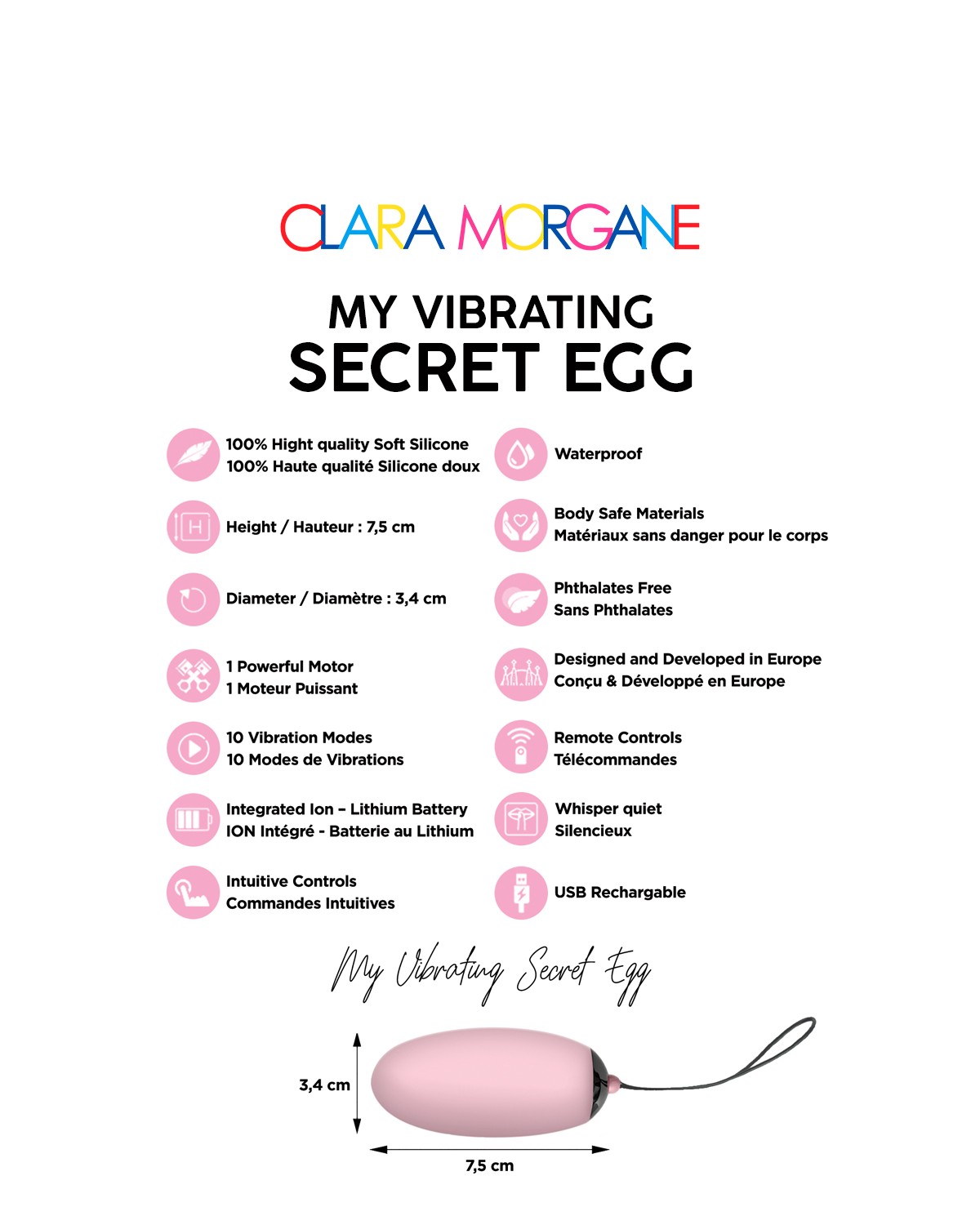 Découvrez les oeufs nouvelle génération de la marque Clara Morgane. En plus de leurs designs innovants, ces petits bijoux sont rechargeables à l’aide d’un câble USB.Le secret egg s’utilise partout : Restaurants, musées, salles de spectacle, cinémas : foncez et vibrez !Alors, allez-vous ajouter du piment à caractère extrême dans vos sorties ?Hauteur : 7,5 cmPoids avec emballage : 165 gMatière : ABS / SiliconePour : Femme/ CoupleUsage : VaginalHealth : sans phtalatesDiamètre : 3,4 cmVibrant : OuiFonctions : 10 modes de vibrationBatterie : Rechargeable USBAlimentation fournie : ouiMoteurs : 1Modes vibration/utilisation : 10Waterproof : WaterproofType de batterie : Batterie Lithuim intégréePrix de vente conseillé : 69,99