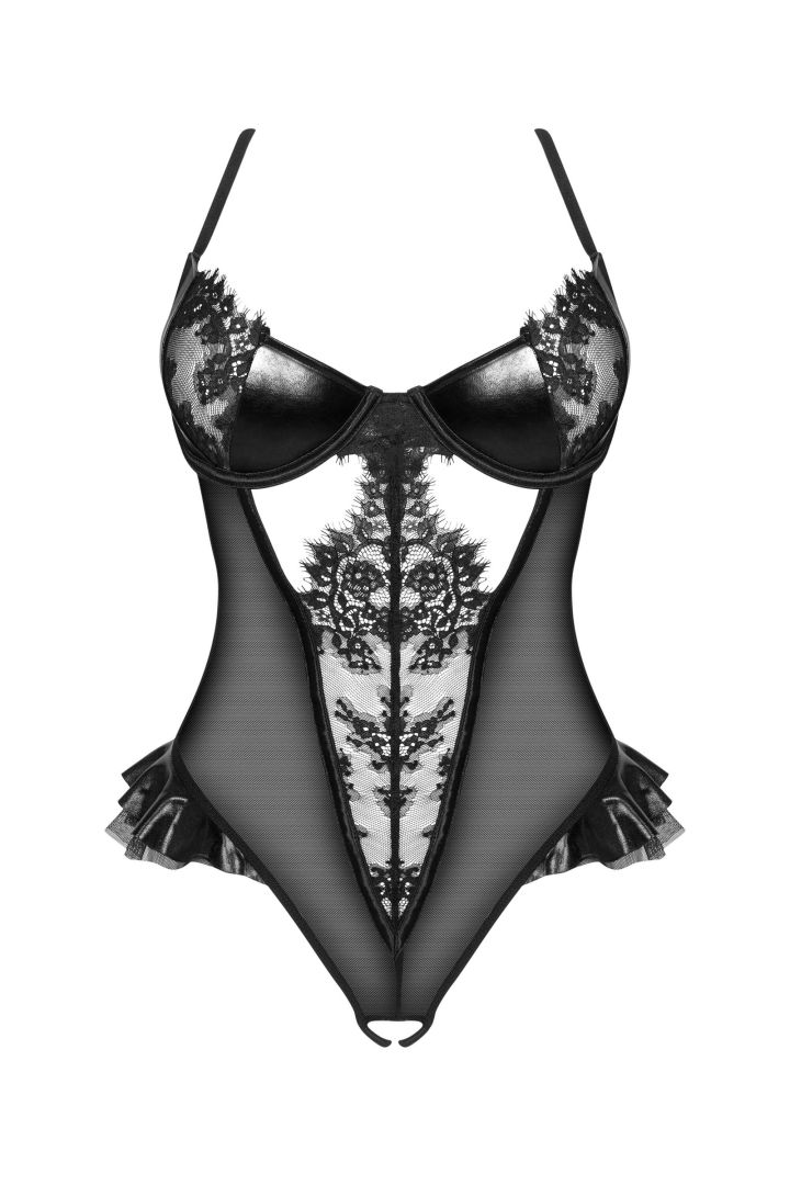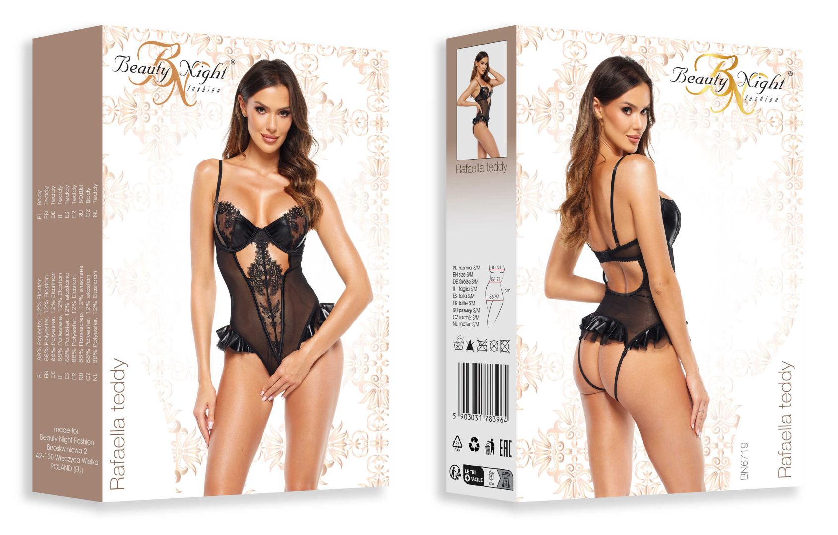 Ce superbe corps de la série Rafaella est fabriqué à partir d?une combinaison de dentelle, tulle et wetlook, qui accentue la silhouette tout en ajoutant élégance et sensualité. Les bonnets sont ornés de dentelle délicate, mettant subtilement en valeur le buste d?une manière séduisante mais raffinée. Le devant ouvert, orné d?empiècements en tulle et dentelle, ajoute de la sophistication. Le dos est orné de volants ludiques, ajoutant une touche féminine pour compléter le look. Ce corps est le mélange parfait d?élégance et de sensualité, ce qui en fait un choix idéal pour les soirées romantiques et les occasions spéciales.    Matériau : Le tulle délicat et les inserts wetlook magnifiquement soulignent les courbes.    Bonnets : Ornés de dentelle, rehaussant subtilement le buste.    Design : Ouvert devant avec des détails de dentelle et découpe.    Dos : Décoré de volants ludiques, ajoutant une touche légère et féminine.    Sangles réglables : assurant un ajustement parfait.    Fermeture : Crochet et ?illet à l?arrière pour un port confortable.    Utilisation : Parfait pour les occasions spéciales ou les soirées sensuelles.    Prêt à offrir : Le corps est livré dans une boîte élégante avec l?image du produit.La dentelle et les détails subtils vous feront sentir belle et sensuelle.Messieurs, offrez quelque chose qui enchantera votre bien-aimé.Taille : S/M et L/XLTaille S/M : (Poitrine : 81-91 cm, B-C, Taille : 56-71 cm, Hanche : 85-97 cm)Taille L/XL : (Poitrine : 91-107 cm, C-D, Taille : 71-91 cm, Hanche : 97-112 cm)Matière : 88 % polyester, 12 % élasthanne