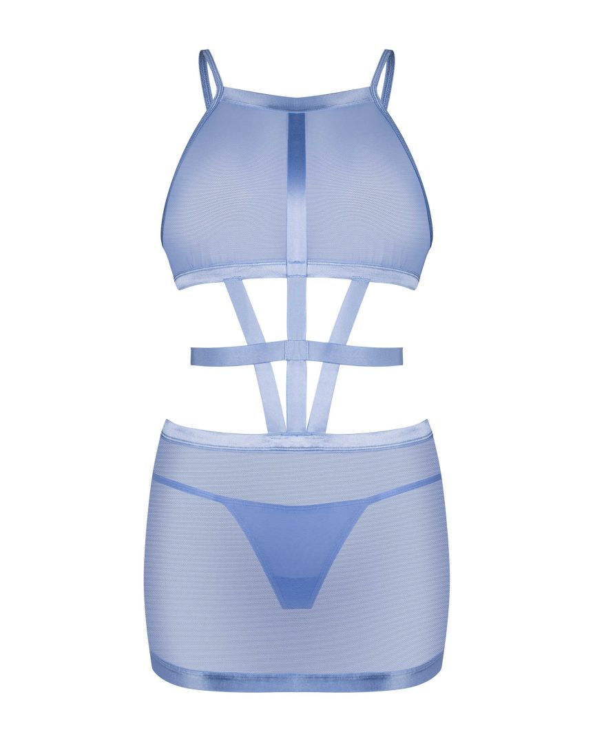 Robe et string ShaderiUne robe et un string bleu Shaderi envoûtant, confectionnés en filet transparent. De larges bretelles élastiques sur le ventre relient le haut et le bas. Une ceinture réglable accentue les courbes féminines et des tissus doux de qualité supérieure assurent un ajustement impeccable. La fermeture à crochet dans le dos ajoute du confort. Complétée par un string classique au design unique. robe bleue et stringdesign modernetissus de haute qualitésangles supplémentaires sur le ventre et autour de la tailleAjustement parfait avec sangles réglables et crochet pour un confort optimal 94% polyamide, 6% élasthanneconçu dans l?UEsans nickel