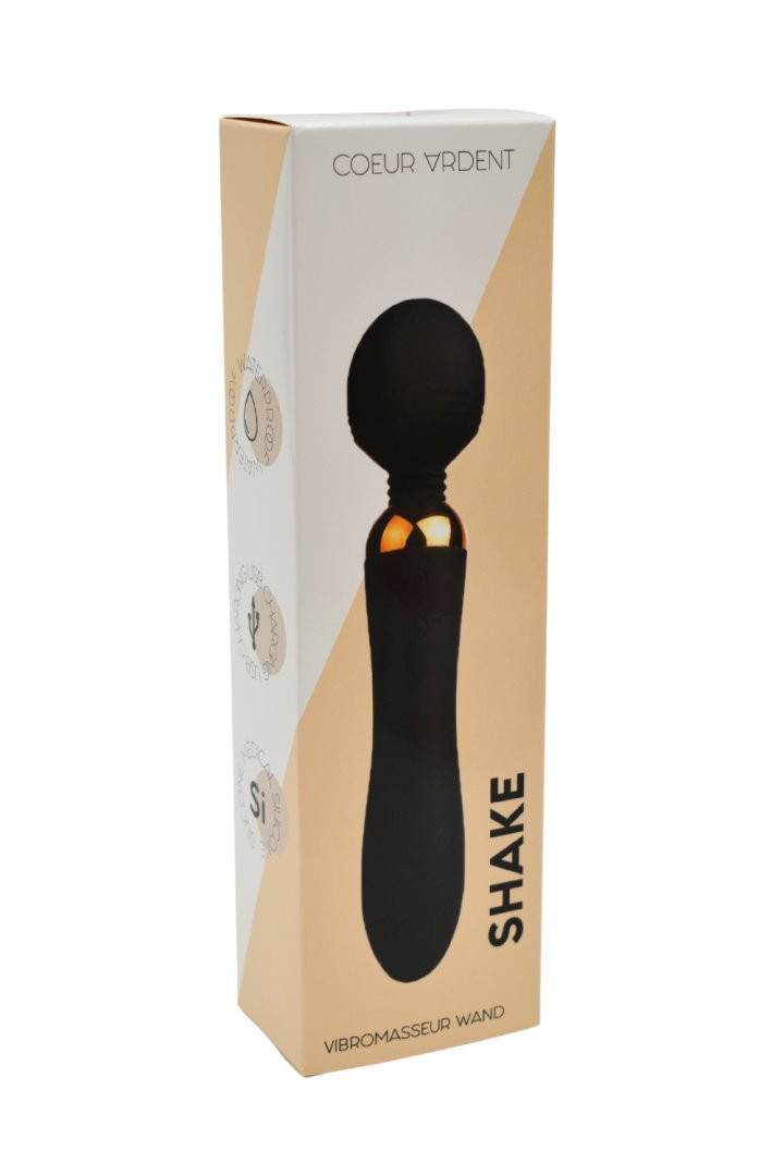 SHAKE, Vibromasseur Wand 2 en 1, Noir en silicone avec 2 puissants moteurs indépendants. Sa tête flexible et sa partie vibromasseur, possèdent, chacune 9 modes de vibrations pour des moments intenses et voluptueux. Réalisez un appui long sur un des boutons pour Allumer et Eteindre le Wand. Puis, appuyez sur la flèche du Haut pour changer les modes de vibration de la tête et sur la flèche du bas pour choisir les vibrations de la partie Vibromasseur.Waterproof Silencieux avec moins de 45dB max.Dimensions : 222 x 48 mm Temps de charge 60 minutes pour 90 minutes de plaisir – Chargement magnétique avec câble de chargement USB Matières: Silicone et ABS – sans phtalates Poids 215 Gr